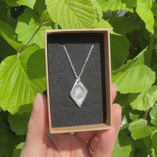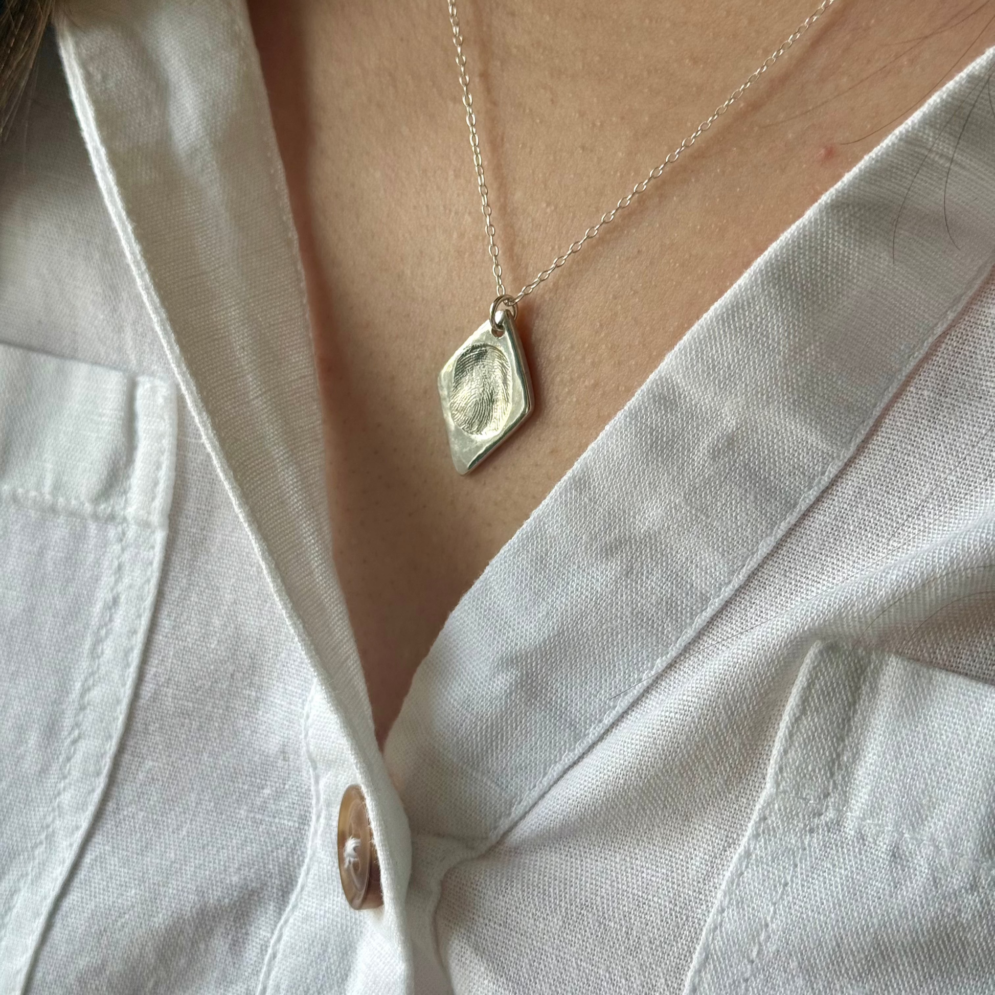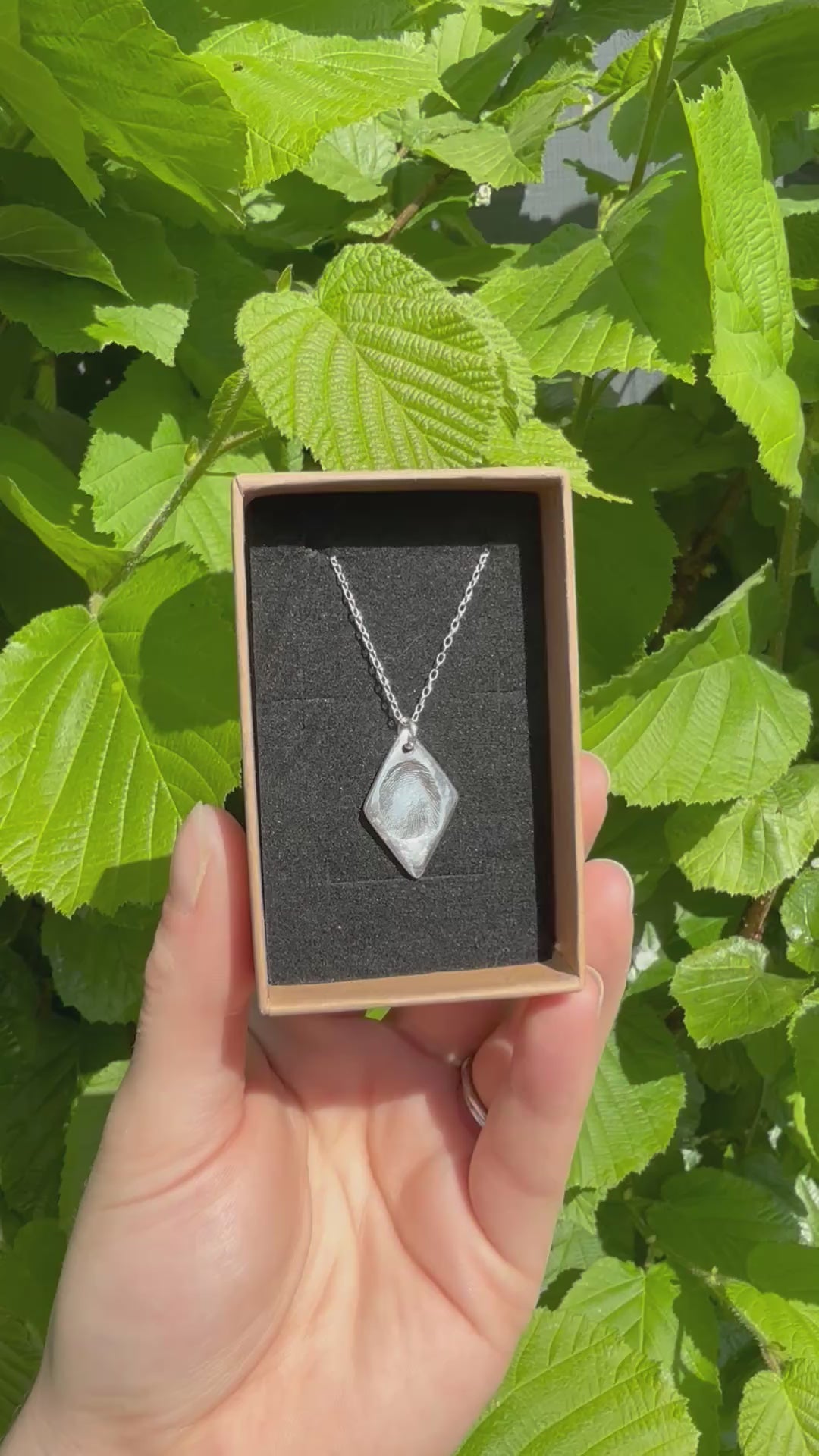 Capture a moment, forever. This beautifully handcrafted necklace features a striking diamond-shaped pendant made from fine silver, delicately imprinted with a unique fingerprint, making it the ultimate meaningful gift.