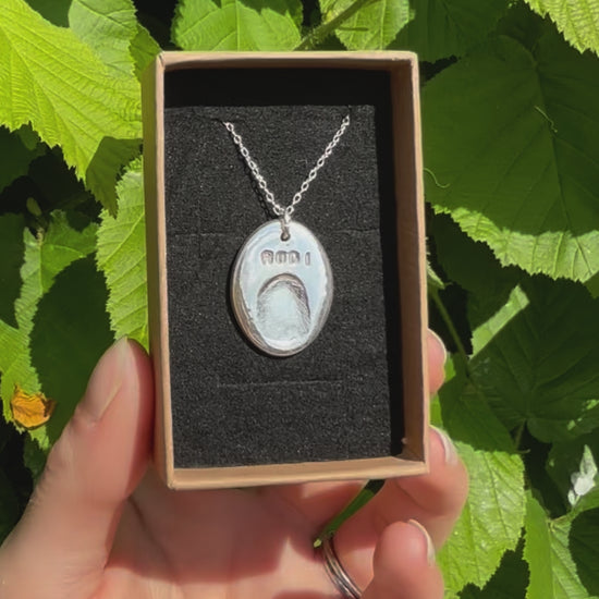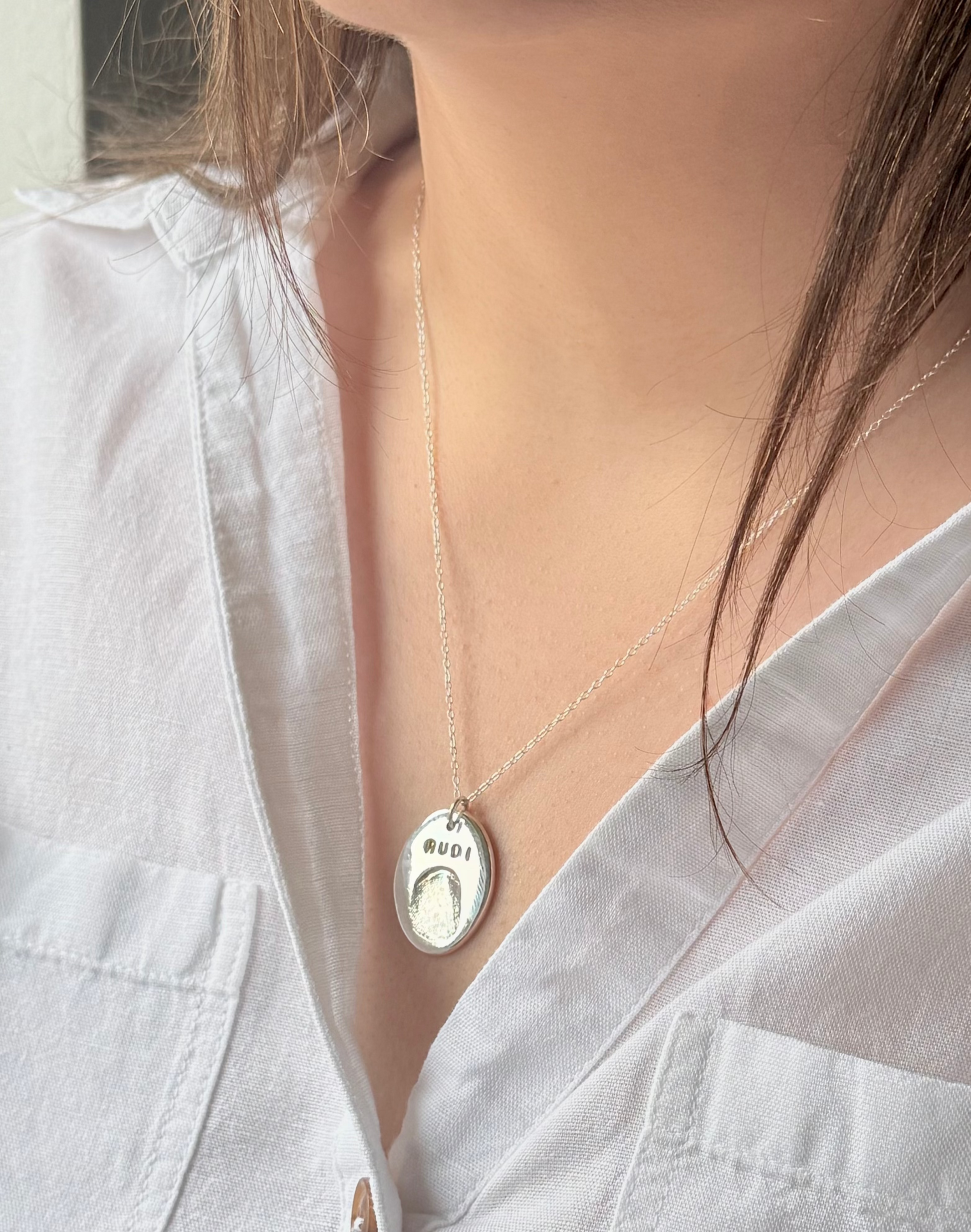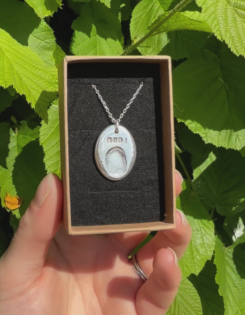Capture a moment forever with our handcrafted Oval Fingerprint Pendant, made from fine silver and suspended elegantly on an 18-inch, 1.7mm trace chain. This meaningful piece features a loved one's actual fingerprint and their name (up to 6 characters) stamped on the front, creating a truly personal keepsake they'll cherish forever.